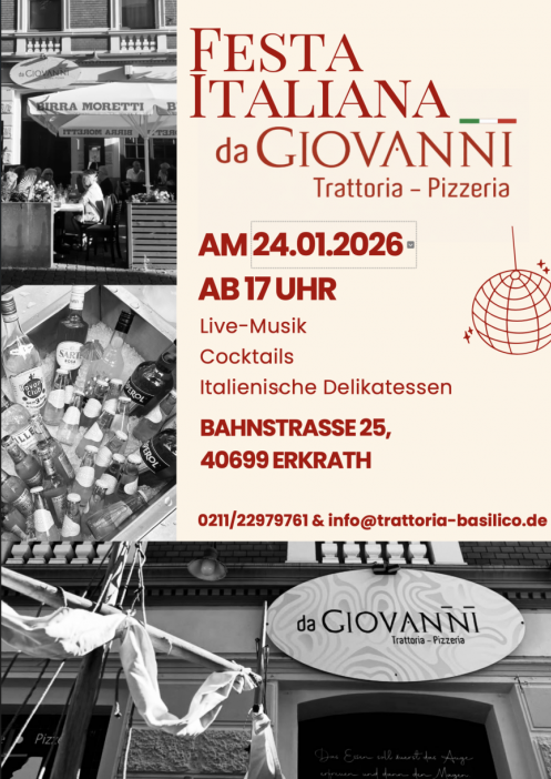 Wir würden uns freuen, Ihre Feierlichkeit nach Ihren Wünschen in unserer Trattoria „DA GIOVANNI“ ausrichten zu dürfen. Für weitere Fragen stehen Ihnen unsere Servicemitarbeiter aus Restaurant gern zur Verfügung.